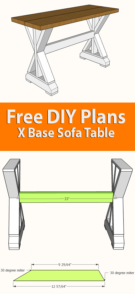 These X-base sofa table plans are designed so that you can use a single 2x10x8′ cut in half as the table top. After you cut the 2×10, there’s no need to attach the two boards to each other – simply use wood glue and screws through the 1×4 on the top of each X base to secure the top in place. Of course, you want to ensure you have the boards positioned perfectly before screwing them in. This should mean a 4″ overhang on each end, and a 1/2″ overhang on the sides.